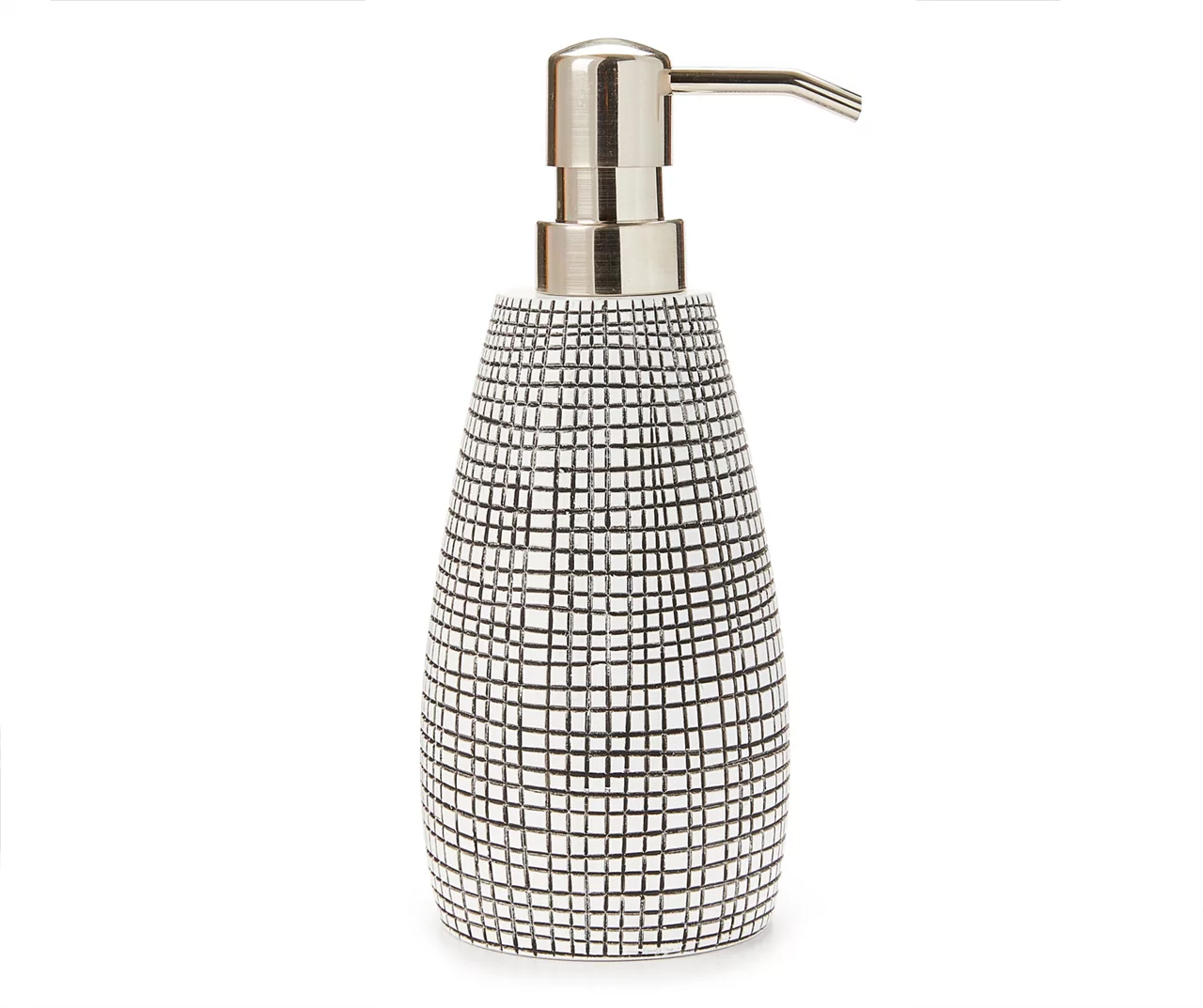 This lotion pump from Broyhill is constructed from solid white polyresin. A black grid, hand drawn and embossed, adds texture and contrast to the simple clean shape. The pump top is brushed nickel, giving this contemporary design a fun casual sensibility. Simply fill with your favorite lotion to delight guests at the bathroom sink.